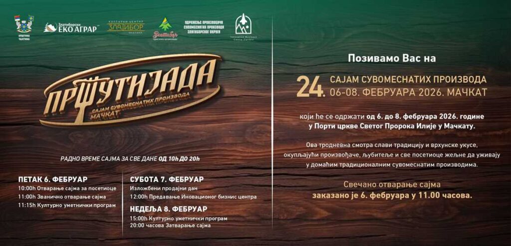 Pršutijada, tradicionalna manifestacija, 24. po redu biće održana od 6. do 8. februara u porti crkve Svetog proroka Ilije u Mačkatu. Organizatori pozivaju posetioce da uživaju u autentičnim ukusima, bogatom programu i gostoprimstvu zlatiborskog kraja.